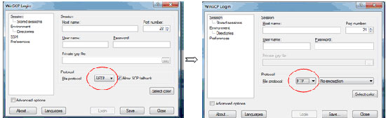 (α) Αφού ανοίξετε το πρόγραμμα WinSCP, αλλάζετε την επιλογή στο πεδίο "File Protocol" από SFTP σε FTP