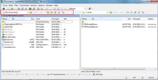 (δ) Αφού εισάγετε τους κωδικούς, παρουσιάζεται ένα παράθυρο χωρισμένο σε δύο μέρη. Ο αριστερός χώρος αντιπροσωπεύει τον υπολογιστή σας, όπου εργάζεστε και διατηρείτε τα αρχεία σας. Ο δεξιός χώρος αντιπροσωπεύει τον χώρο του FTP HOST. Η πλοήγηση στον αριστερό χώρο γίνεται με τα εργαλεία που φαίνονται στο κόκκινο πλαίσιο πιο κάτω. Με αυτά οδηγείστε (browse) στην τοποθεσία του υπολογιστή που έχετε αποθηκευμένα τα αρχεία που θα ανεβάσετε στον χώρο του FTP.