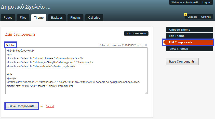 4.6. Τροποποίηση component sidebar και splashes: Τα περισσότερα Πρότυπα ιστότοπου που παρέχονται από την Υπηρεσία περιλαμβάνουν πλαϊνό μενού (sidebar), το οποίο μπορείτε να επεξεργαστείτε. Επιλέγοντας την ετικέτα «Theme», εμφανίζεται η σελίδα «Edit Components» όπου μπορείτε να επεξεργαστείτε τα components «sidebar», «splashes» και άλλα τροποποιώντας ή/και εισάγοντας τον σωστό κώδικα στο αντίστοιχο παράθυρο.