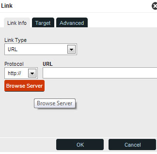 Για σύνδεση με αρχεία, στο πεδίο «Link Type» επιλέγετε «URL» και «Browse server». Από το παράθυρο «Uploaded files» που παρουσιάζεται, επιλέγετε το φάκελο (folder) όπου έχετε φυλάξει τα αρχεία σας και στη συνέχεια το αρχείο προς σύνδεση. Για να ανοίγει το αρχείο σε νέο παράθυρο, επιλέξτε την ετικέτα «Target» και στο πεδίο «Target», επιλέξτε «New Window (_blank)». Τέλος, πατήστε «ΟΚ».