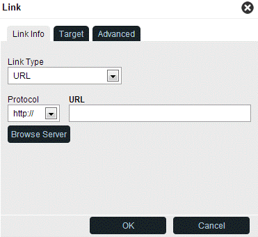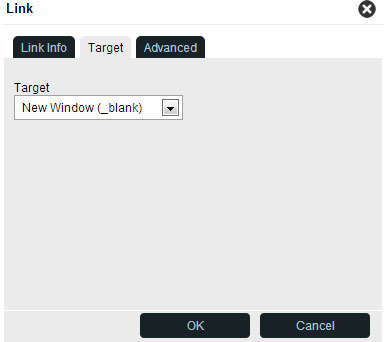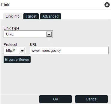στο πεδίο «Link Type», επιλέγετε URL και στο πεδίο «URL» εισάγετε την ηλεκτρονική διεύθυνση (URL) της ιστοσελίδας στο διαδίκτυο. Για να ανοίγει η ιστοσελίδα σε νέο παράθυρο, επιλέξτε την ετικέτα «Target» και στο πεδίο «Target», επιλέξτε «New Window (_blank)».