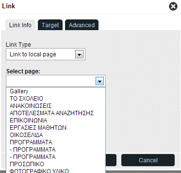 Για σύνδεση με σελίδα που δημιουργήσατε, στο πεδίο «Link Type» επιλέγετε από το αναδυόμενο μενού «Link to local page» και στο πεδίο «Select Page» επιλέγετε τη σελίδα που θα γίνει η σύνδεση. Τέλος, πατήστε «ΟΚ».