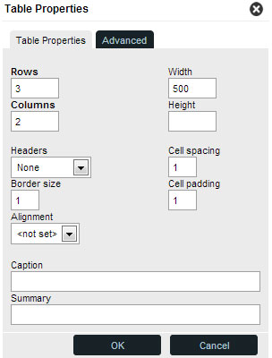 4.2. Εισαγωγή Πίνακα: Για να εισάγετε πίνακα, επιλέξτε το εικονίδιο και από το αναδυόμενο παράθυρο στην ετικέτα «Table Properties» επιλέξτε τον αριθμό των γραμμών (rows) και των στηλών (columns), καθώς και το μέγεθος του περιγράμματος του πίνακα (border).