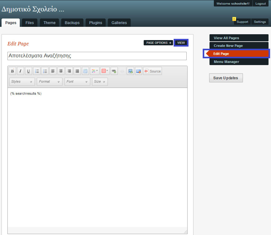 4.5. Προεπισκόπηση σελίδων: Για προεπισκόπηση των σελίδων κάθε φορά που κάνετε κάποια αλλαγή ή/και προσθήκη, επιλέγετε «View».