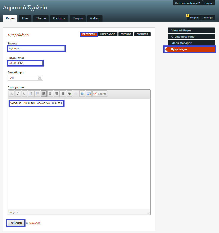 Για να εισάγετε εκδηλώσεις/γεγονότα στο ημερολόγιο, ακολουθήστε τα εξής βήματα: